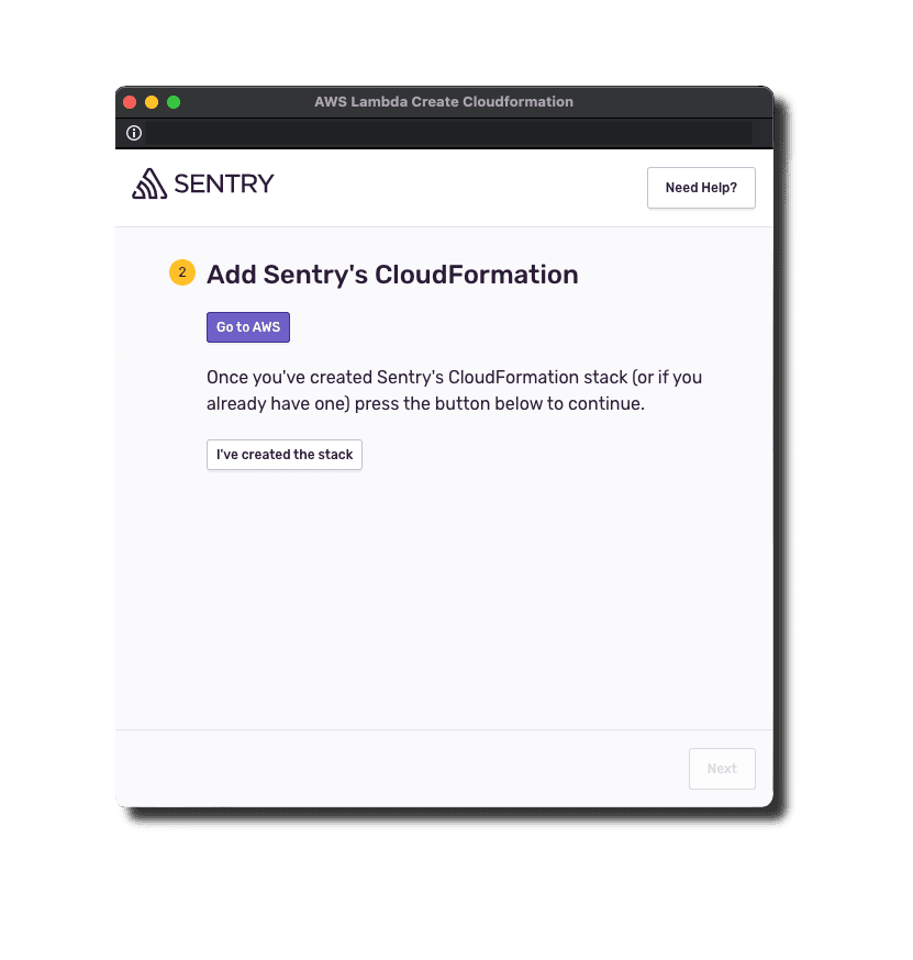 Scroll to the bottom of the Create Stack page, check the box, then press Create Stack to create a CloudFormation stack in your current region. This stack allows Sentry to automatically instrument your Lambda functions.