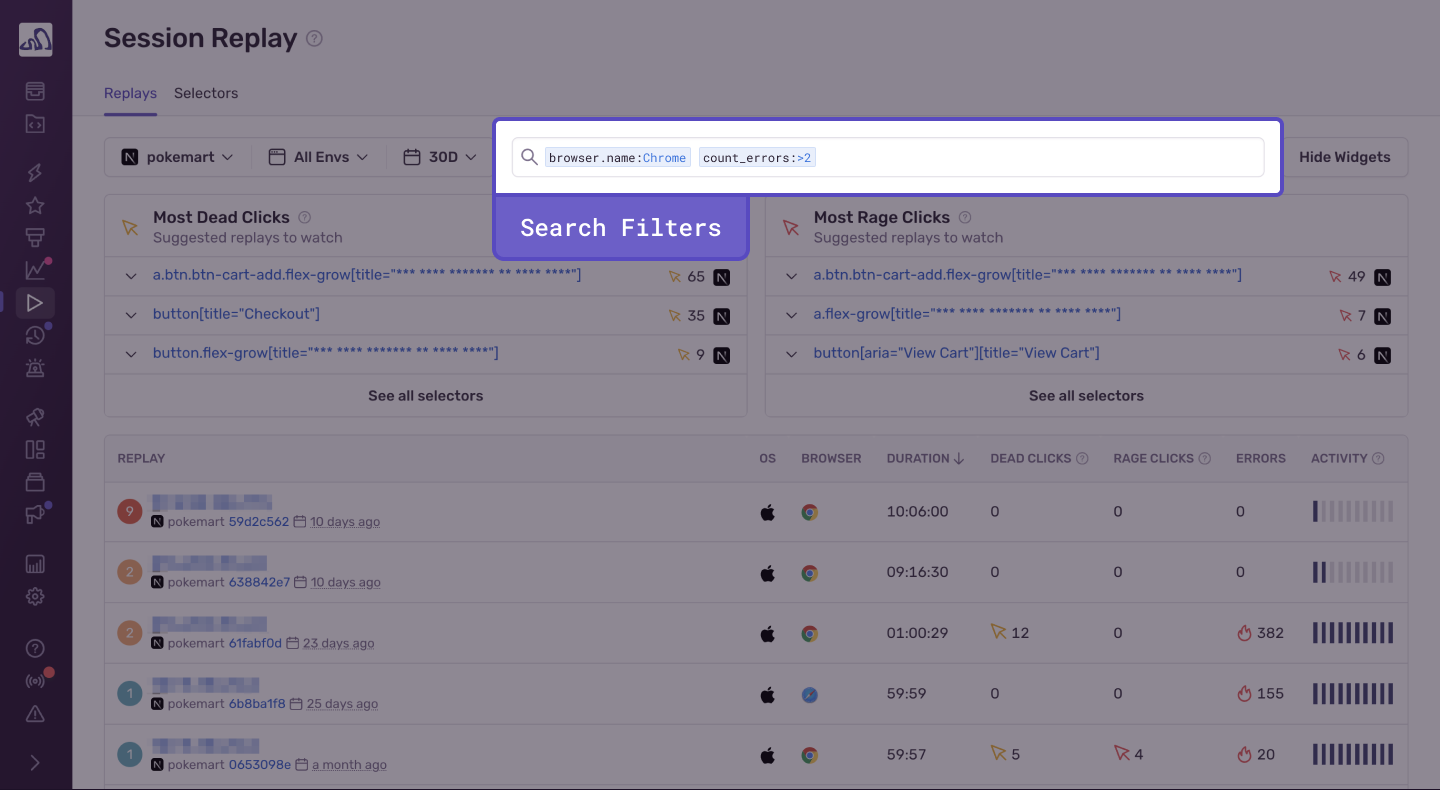 Learn how to navigate the Replays page and filter user sessions that meet specific conditions.