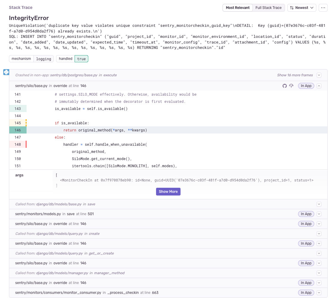 Sometimes the Trace Navigator will be replaced by a Trace-related Issue. A Trace-related Issue is a different issue that occurred during the same trace as the event in view. This is useful for understanding the context of the current issue and may help you identify its root cause. A Trace-related Issue allows the developer to quickly navigate between the two related events.