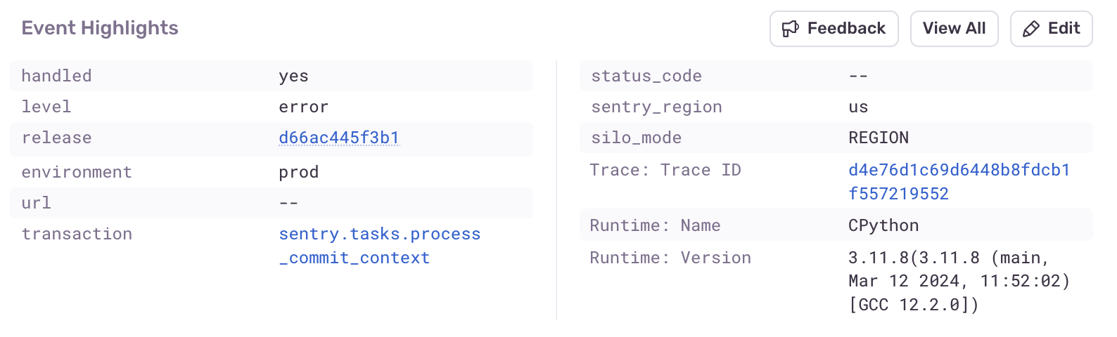 - Event Highlights - Specific tags and context values that are useful for debugging.