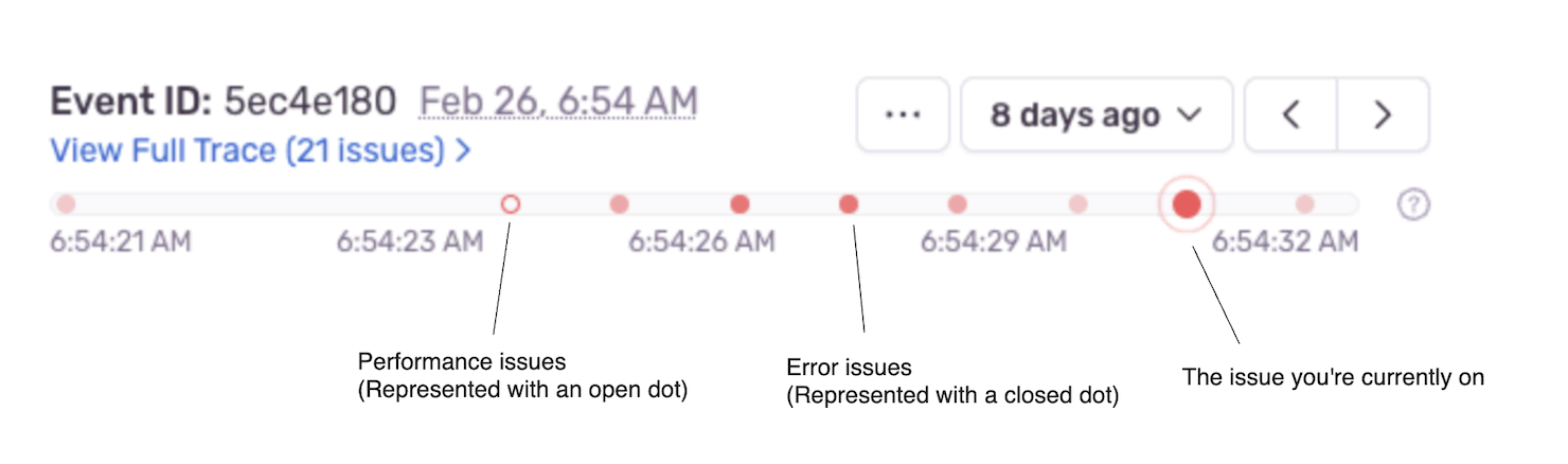 The trace navigator (which you'll see right below the Event ID), is a timeline view that shows any other issues that might be part of the current event's trace. The trace navigator shows up to 100 additional issues and you can click on any of them to view their details. Seeing (and being able to toggle between) multiple issues connected to a single event can be helpful for figuring out what went wrong. Note that the trace navigator is only available for issues that are part of a trace and have more than one issue.