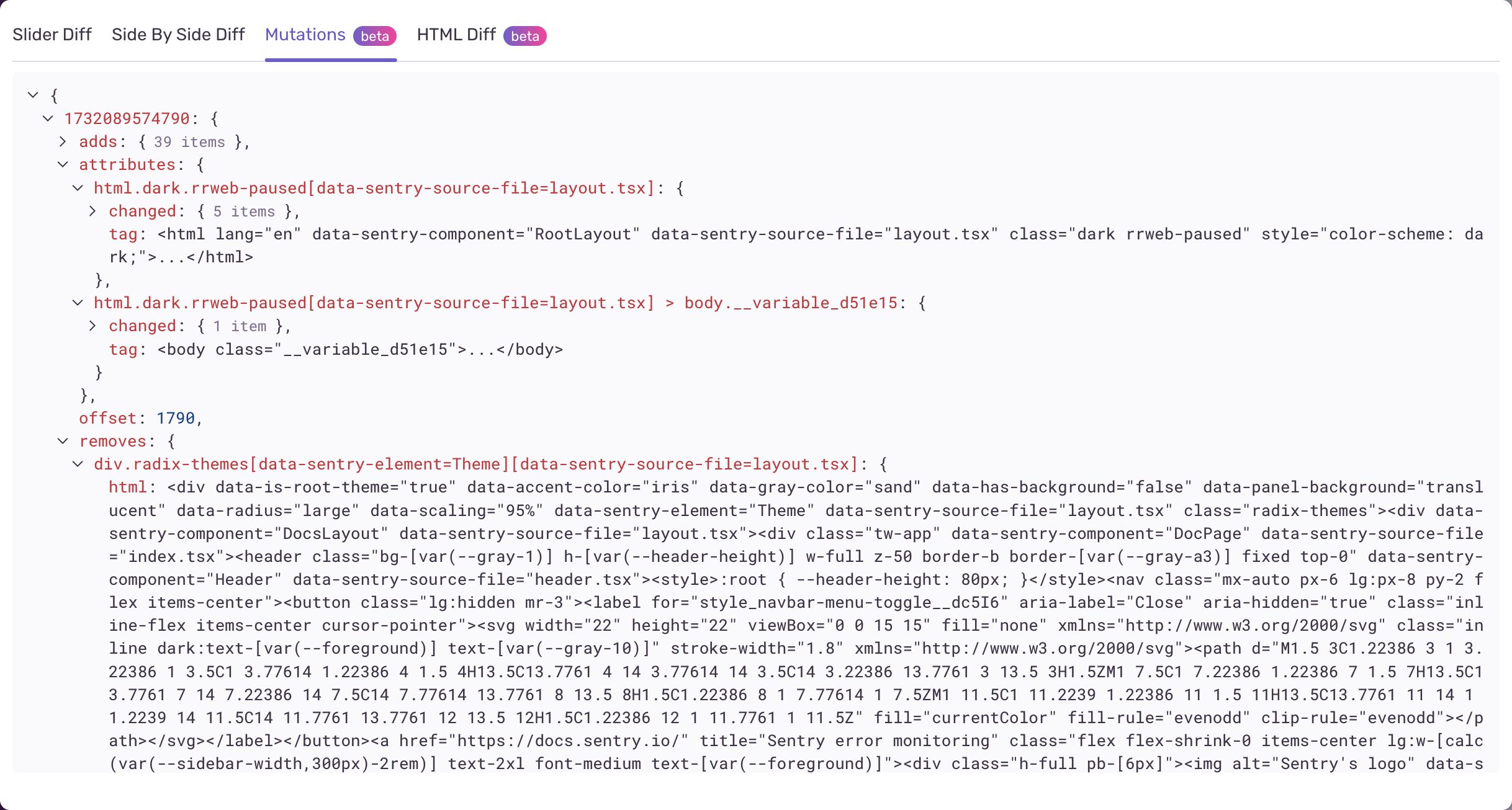 You can see each change to the page, and when it happened within the context of the hydration error. In this case one mutation happened at the timestamp 1732089574790